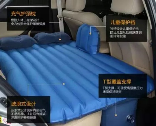 打气后可铺在汽车后座上当床垫用,柔软有弹性,不用时放气叠好,收放简单,比较适合乘车疲劳时在车内睡觉、玩耍。